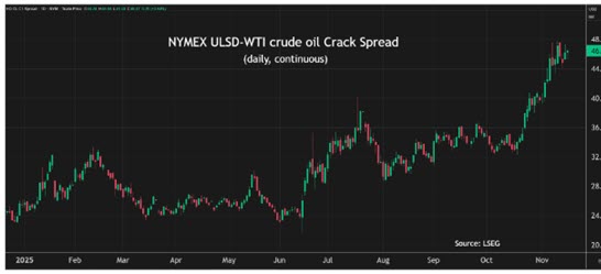 With diesel crack spreads trading at highs not seen since February 2024, refiners are heavily incented to maintain (or increase) refinery throughput – and therefore support crude oil demand.