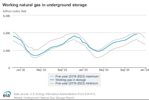 Stocks of natural gas in underground storage ended the refill season above the five-year average. There were 3.776 Tcf of natural gas stored at the end of the refill season on October 31, 2023. This was 5% more than the five-year average and 6.8% more than last year at this time. Only the winter of 2020 began with even higher levels of supply over the past five years.