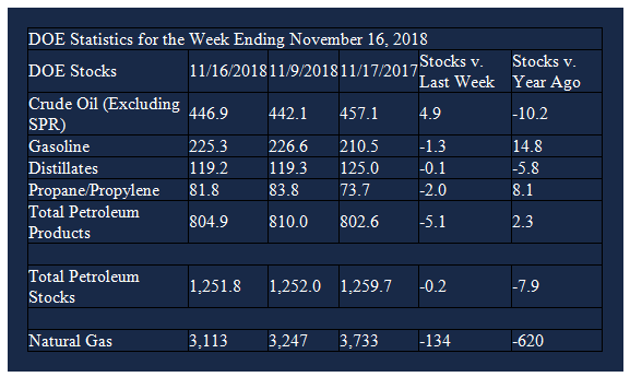 Supply/demand data in the United States for the week ending November 16, 2018 were released by the Energy Information Administration.