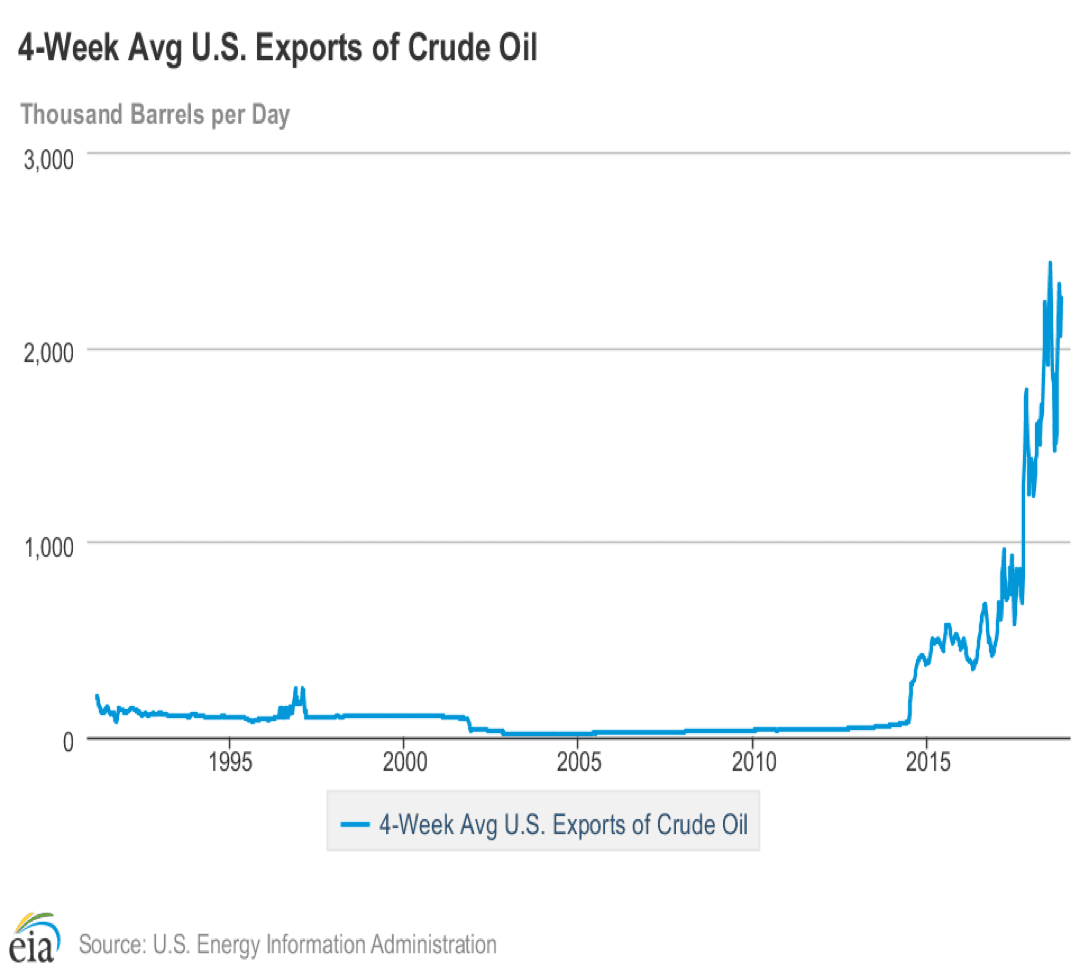 American crude oil exports have steadily increased in the three years since exports were again permitted after a long hiatus. Exports of crude oil from the United States for the four weeks ending October 26, 2018 averaged 2.3 million barrels daily. This amounted to more than twenty per cent of domestic production during that time. Moreover, it points to an important movement toward internationalization of the American oil industry.