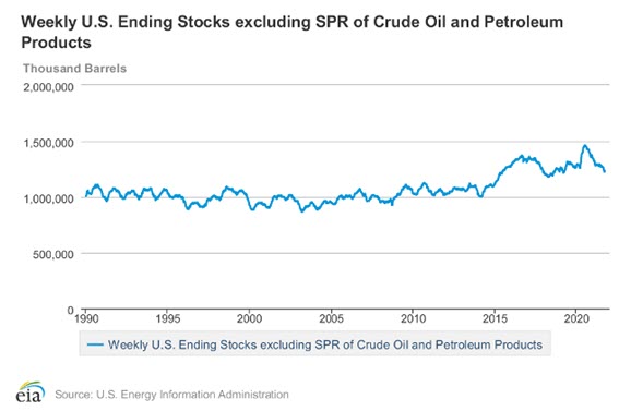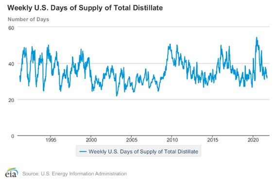 Distillate Days of Supply 1990 – 2021 Source: EIAThe situation for gasoline is similar. There are about 24 days of gasoline in storage. A major difference of course is gasoline now experiences off-season demand which tends to fall. The risk associated with lower supply is much lower now.