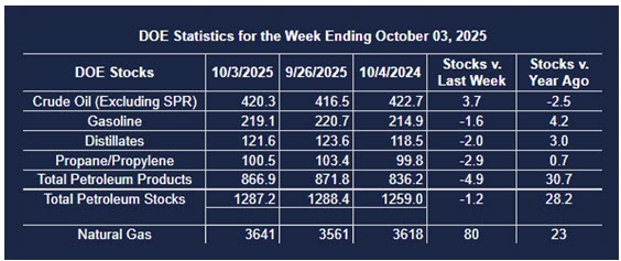 Supply/demand data in the United States for the week ending October 3, 2025, were released by the Energy Information Administration.