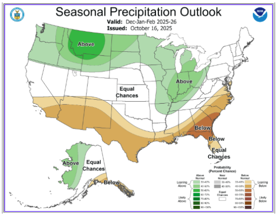 Accuweather forecasts above average precipitation over the Ohio River valley and the Mid-Atlantic states. Snowstorms in opening and closing weeks of the winter season could lead to snowfall totals higher than last winter for the Northeast, although lower than historical averages.