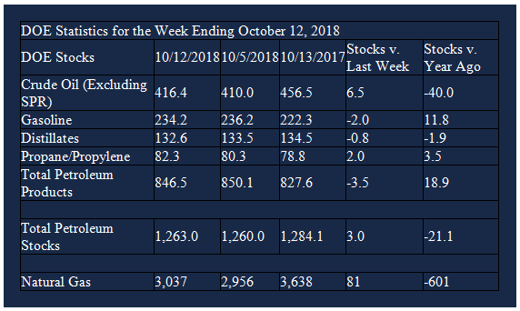 Supply/demand data in the United States for the week ending October 12, 2018 were released by the Energy Information Administration.