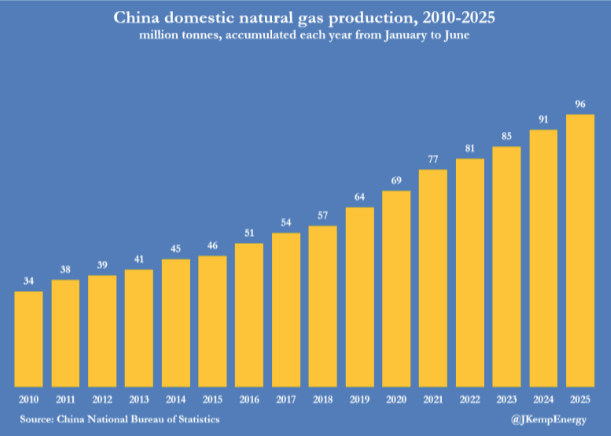 U.S. increased crude oil production by 160% in twenty years (2005-25), China has increased its natural gas production by 182% over the last fifteen years (2010-25).