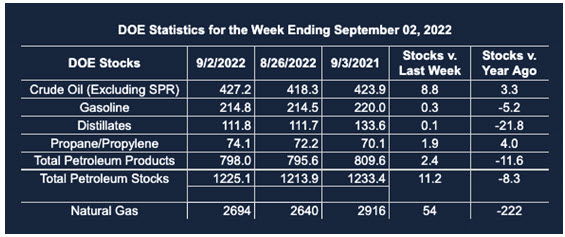 Supply/demand data in the United States for the week ended September 9, 2022, were released by the Energy Information Administration.