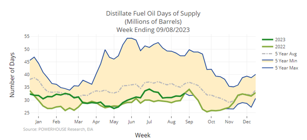 Distillate fuel supply now stands at 31 days, just at the low end of the five-year range. There are only 122.5 million barrels of distillate fuel oil in storage according to the U.S. Petroleum Balance Sheet for the week ended September 8, not far from the industry’s “minimum operating level.”
