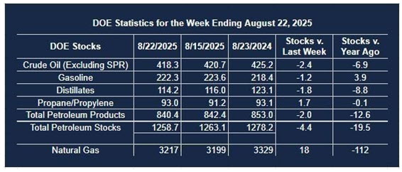 Supply/demand data in the United States for the week ending August 22, 2025, were released by the Energy Information Administration.