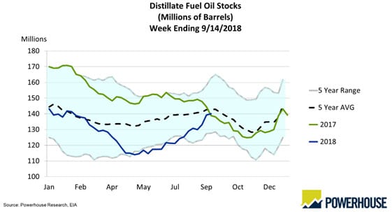 Domestic refinery operations ran at 95.4 per cent of capacity during the week ending September 14, 2018. This was a modest decline from the prior week, and may be the precursor to an autumn refinery turnaround which could see dramatic declines to avert a glut of supply. Distillate fuel oil production reached 5.5 million barrels daily, reportedly a seasonal record.