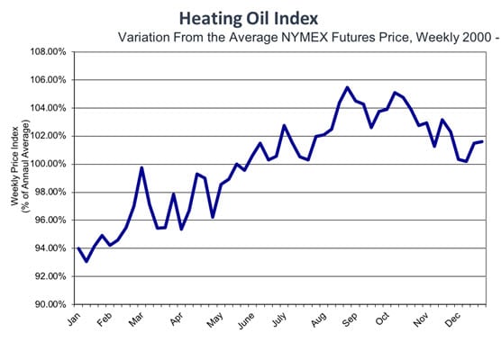 The accompanying chart of the Seasonal ULSD Futures price suggests that prices typically top out at this time of year.