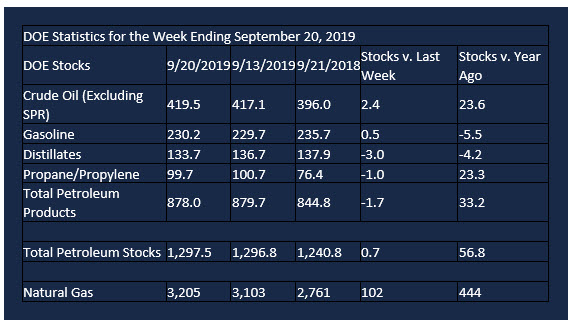Supply/demand data in the United States for the week ending September 20, 2019, were released by the Energy Information Administration.