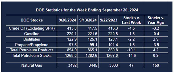 Supply/demand data in the United States for the week ended September 20, 2024, were released by the Energy Information Administration.