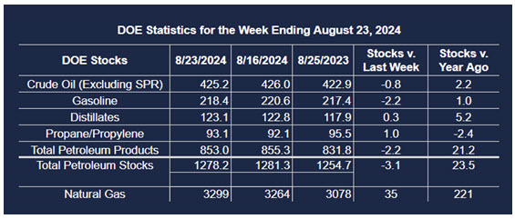 Supply/demand data in the United States for the week ended August 23, 2024, were released by the Energy Information Administration.