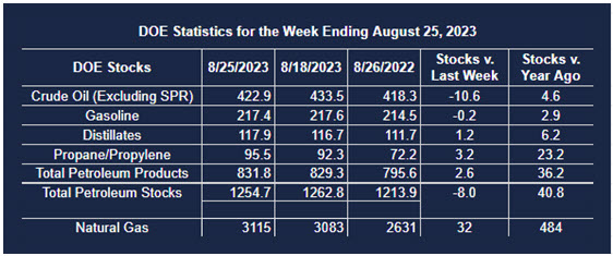 Supply/demand data in the United States for the week ended August 25, 2023, were released by the Energy Information Administration.