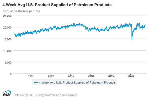 Domestic demand reached 21.4 million barrels daily during the report week. This is moving close to the February 2022 record of 21.9 million daily barrels of consumption.