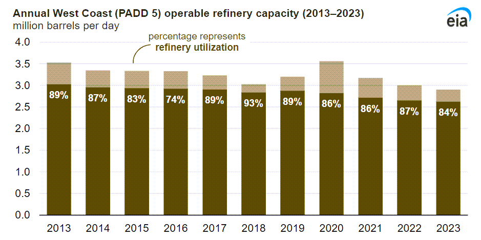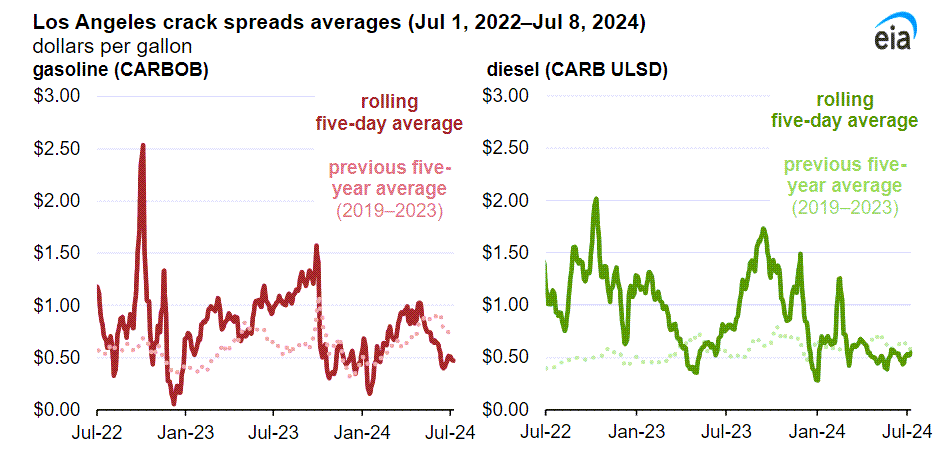 In early May 2024, Los Angeles regional gasoline crack spreads dropped below their previous five-year (2019–23) average for this time of year. Los Angeles is a major pricing center for California, which is itself the largest market on the West Coast. Most West Coast refining capacity is located in California, and market conditions in the state have a significant impact on the broader West Coast region.