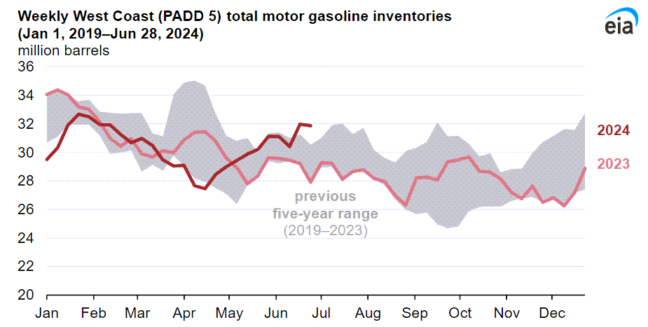 Despite the long-term reductions in West Coast refining capacity, regional gasoline crack spreads have fallen since the end of April as refinery production increased after a period of seasonal maintenance and as motor gasoline consumption decreased, adding to inventories. West Coast gasoline inventories have generally been increasing on a weekly basis since the end of April, according to our Weekly Petroleum Status Report. West Coast motor gasoline consumption decreased 2% year over year in the first quarter of 2024. Lower gasoline consumption may reflect increasing fleet efficiency driven by increased uptake of lower emission vehicles. Shipments of crude oil from western Canada via the Trans-Mountain expansion may also be reducing crude oil acquisition costs for some West Coast refiners, increasing production despite lower crack spreads.
