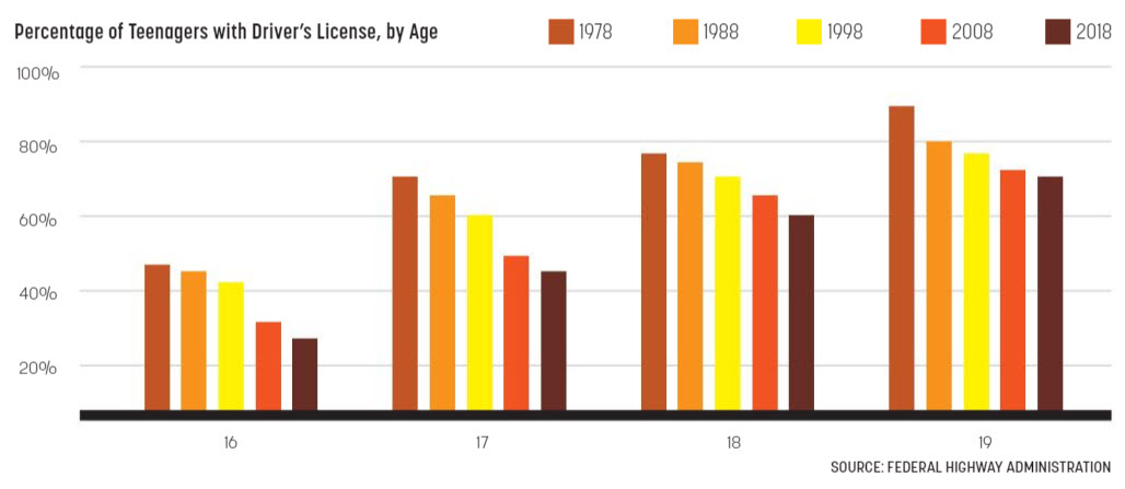Except for those older than 60 years, every age group has seen a decrease in the percentage of its population with a driver’s license. And it is especially pronounced among teenagers, where fewer than 50% of those 17 years of age have a license.
