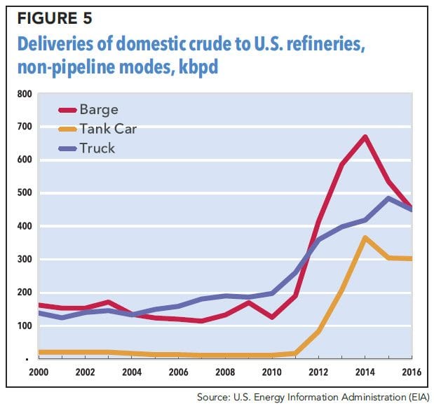 In the U.S., pipelines are the chief mode of transporting crude to refineries. As pipeline capacity was filled, delivery of domestic crude by non-pipeline modes increased. According to the EIA, delivery by barge rose by over 500% (from 126 kbpd in 2010 to 669 kbpd) in 2015. Delivery by tank car grew a whopping 30x (from 12 kbpd in 2010 to 365 kbpd in 2014). Delivery by truck more than doubled during that time, rising from 198 kbpd in 2010, to 418 kbpd in 2014, and to 484 kbpd in 2015. By 2014 – 2015, additional pipeline capacity began to come online, and the use of these other modes began to ebb.
